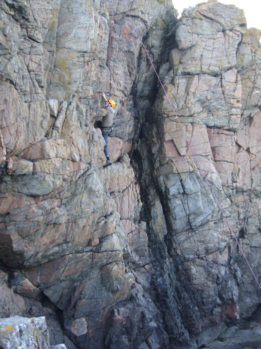 CI David Birch, a qualified single pitch instructor, together with another instructor took six cadets rock climbing on a fine evening to the cliffs at Cove. Donning their safety helments and harnesses they made their way down the winding coastal path to the foot of the cliffs.